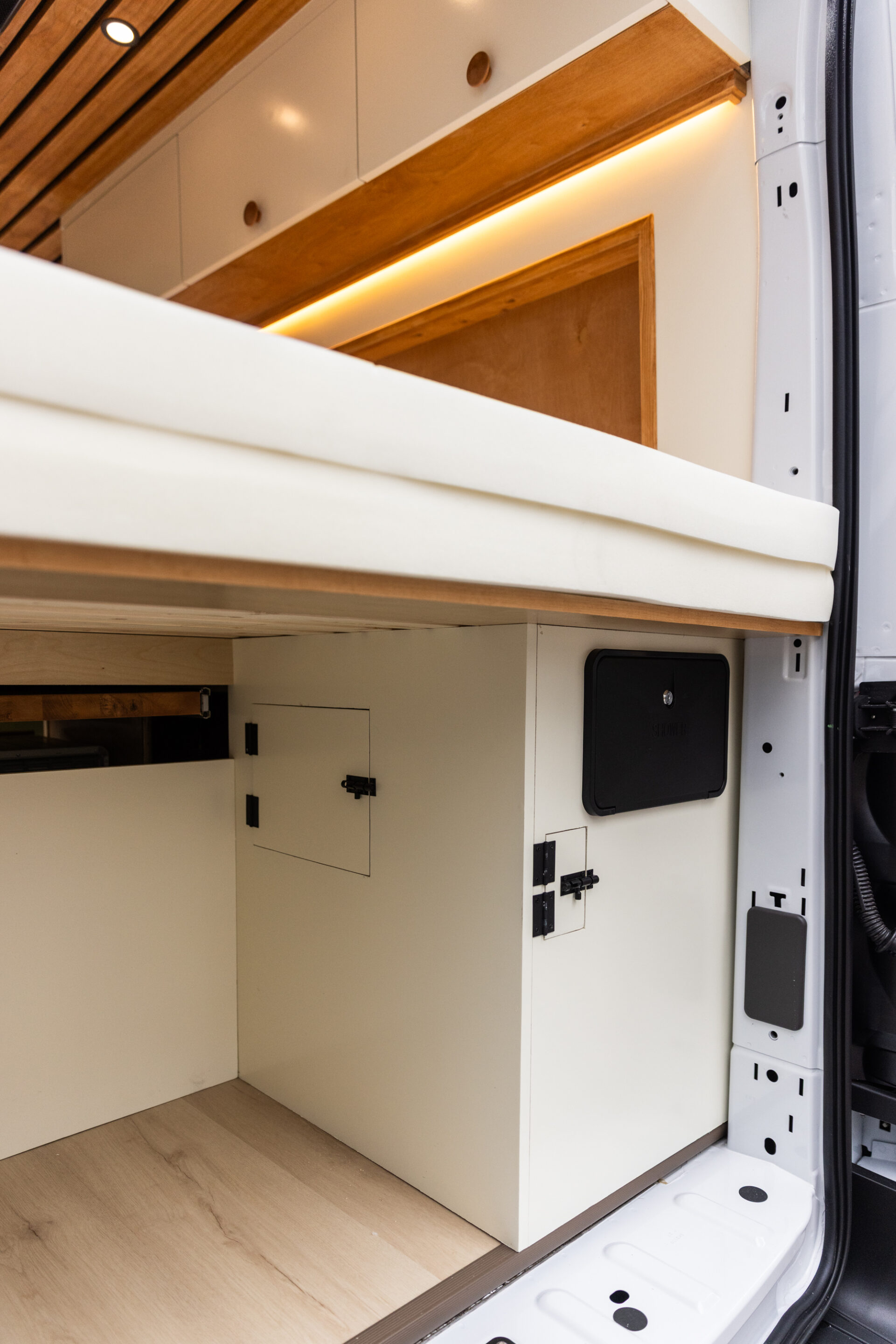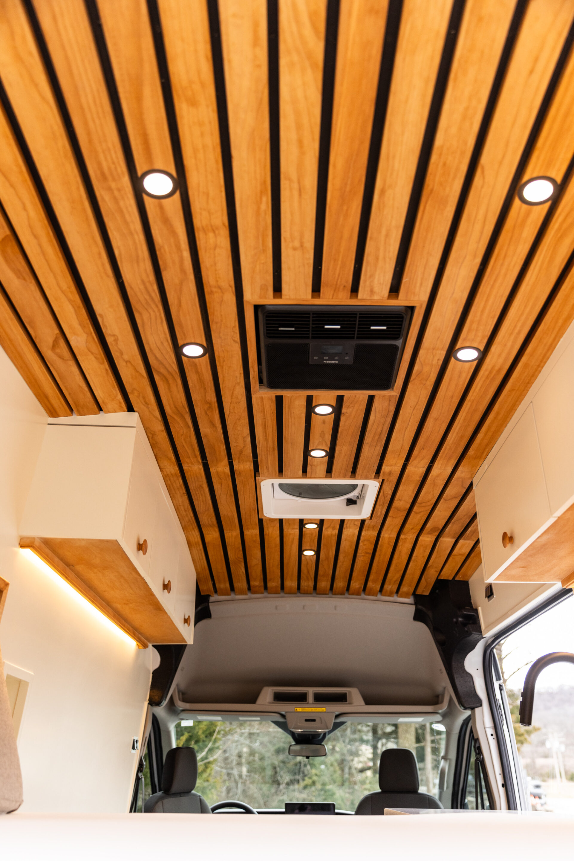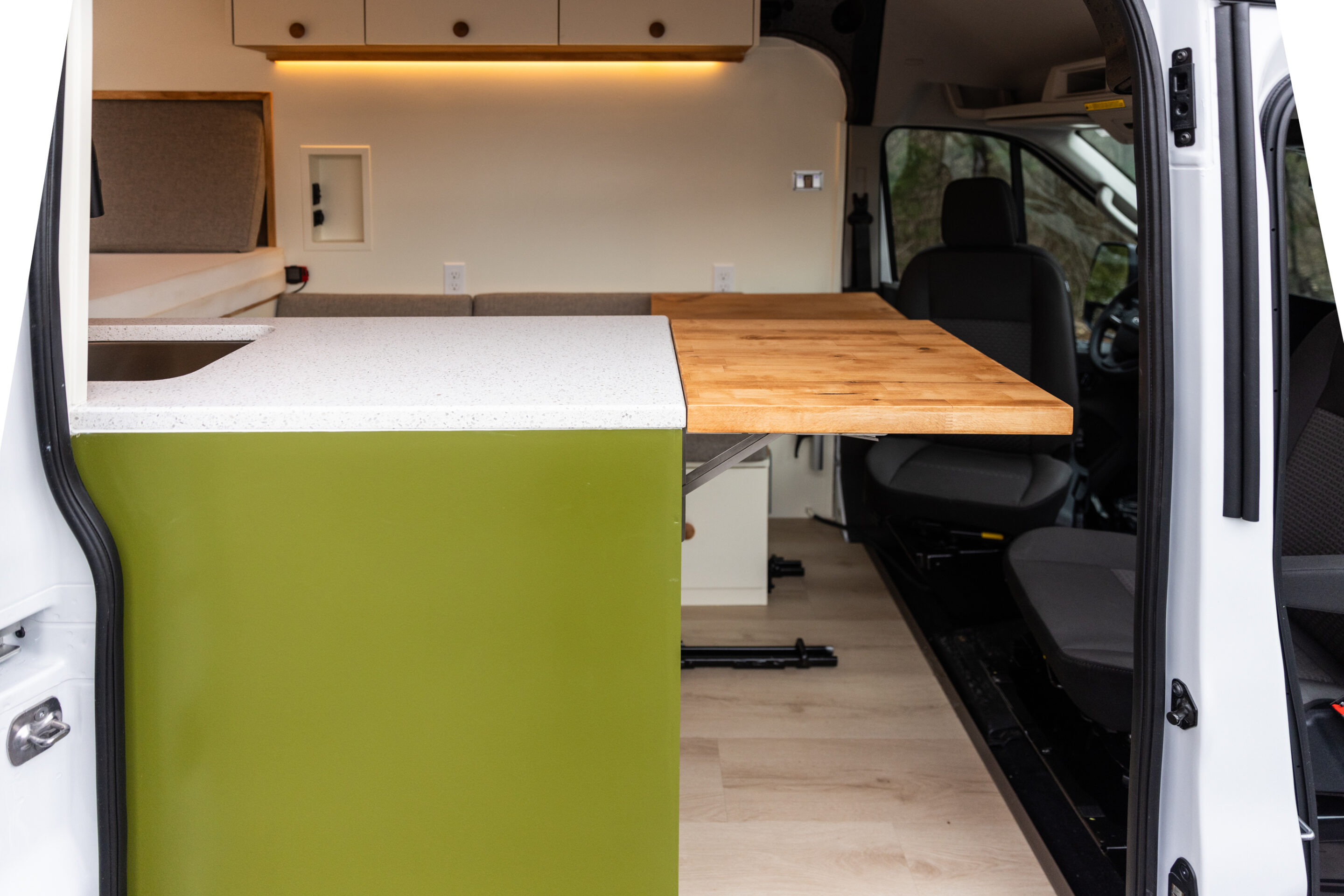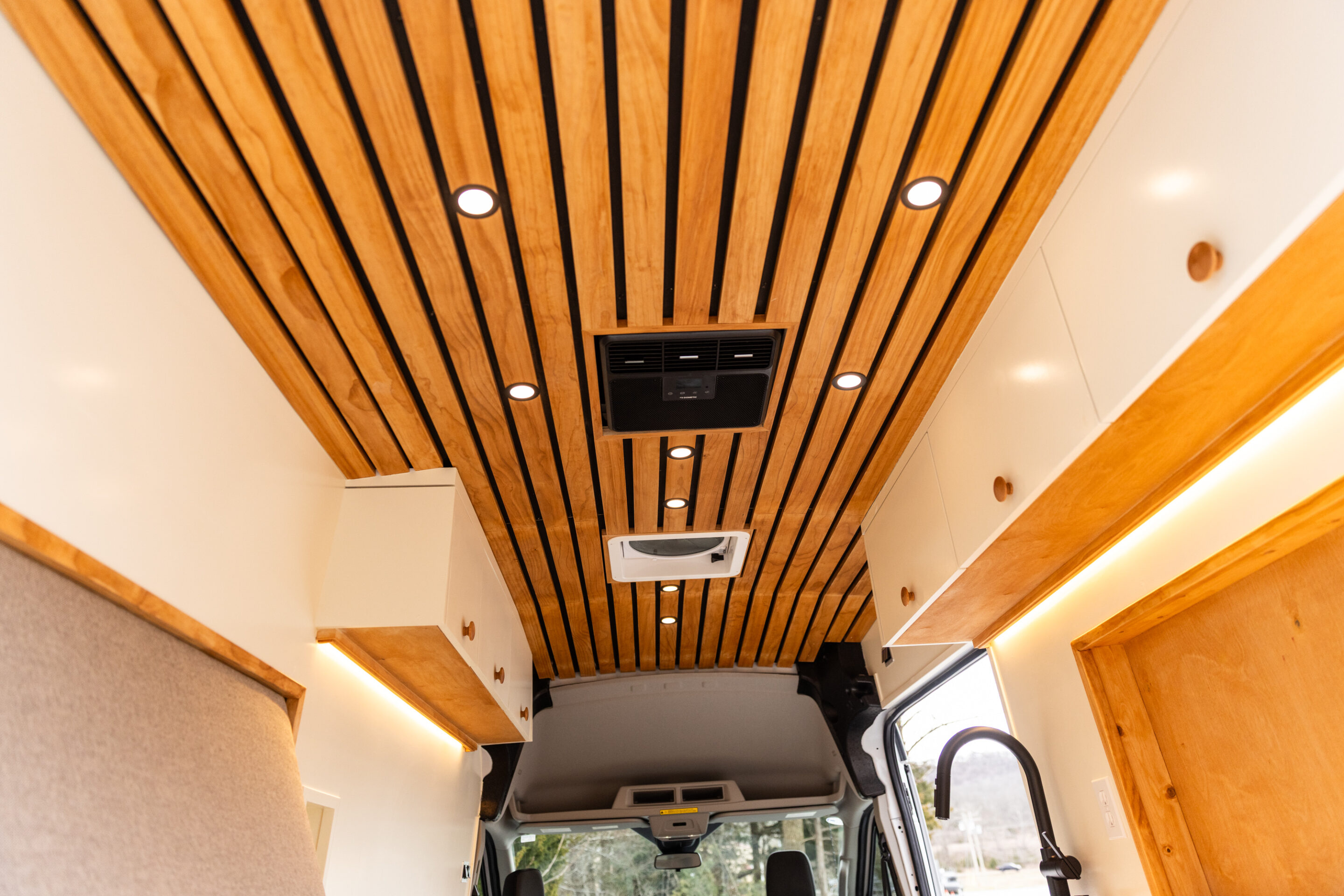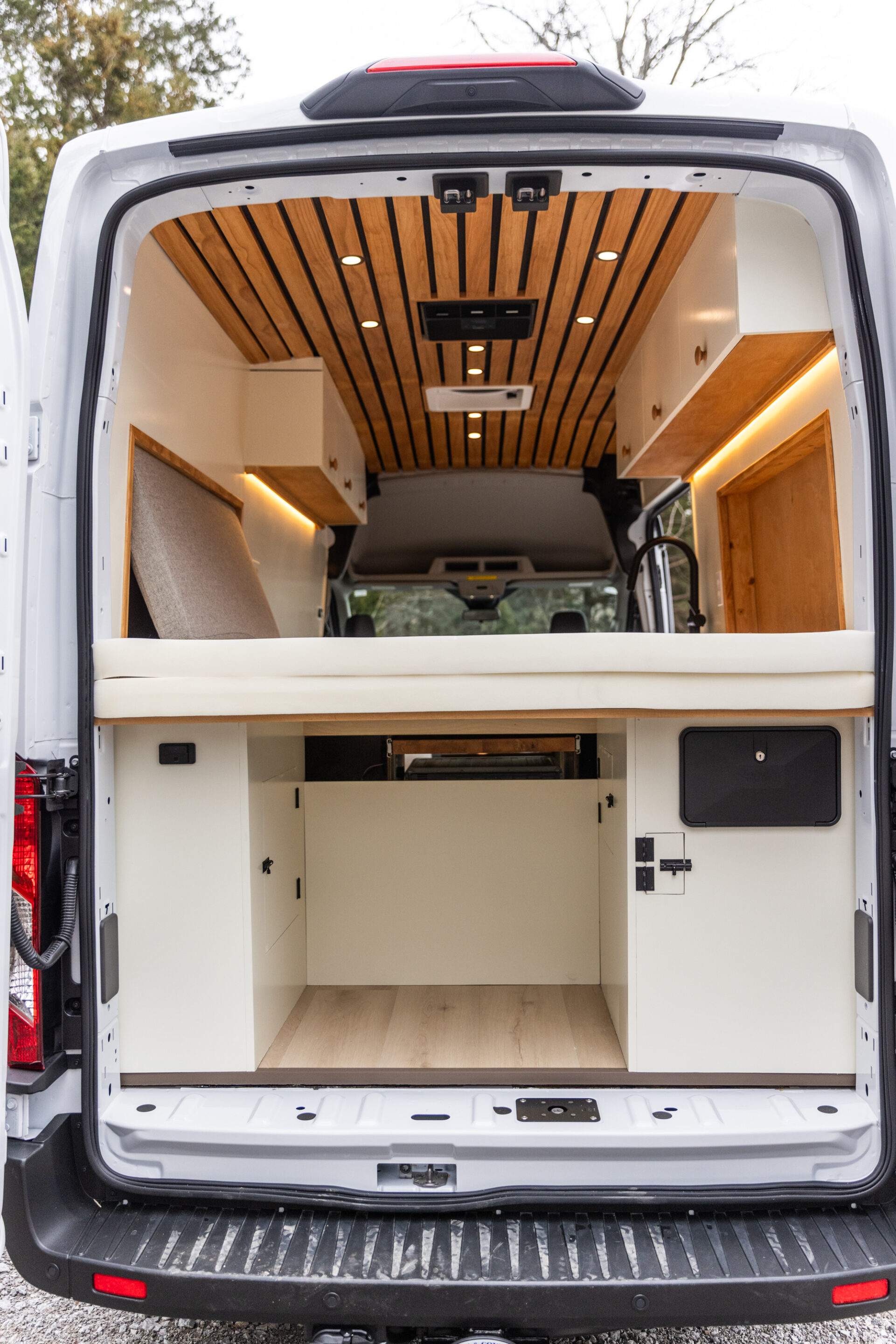 This custom Ford Transit 148 proves you don’t have to sacrifice comfort for adventure. Inside, you’ll find upgraded slat ceilings that add warmth and style, a quartz countertop with an undermount sink, and even a hidden cat litter box cleverly tucked under the bench. Heating, AC, and off-grid capabilities keep you comfortable year-round, while the removable bench seat gives you the flexibility to swap in a factory seat and bring up to four people along for the ride.