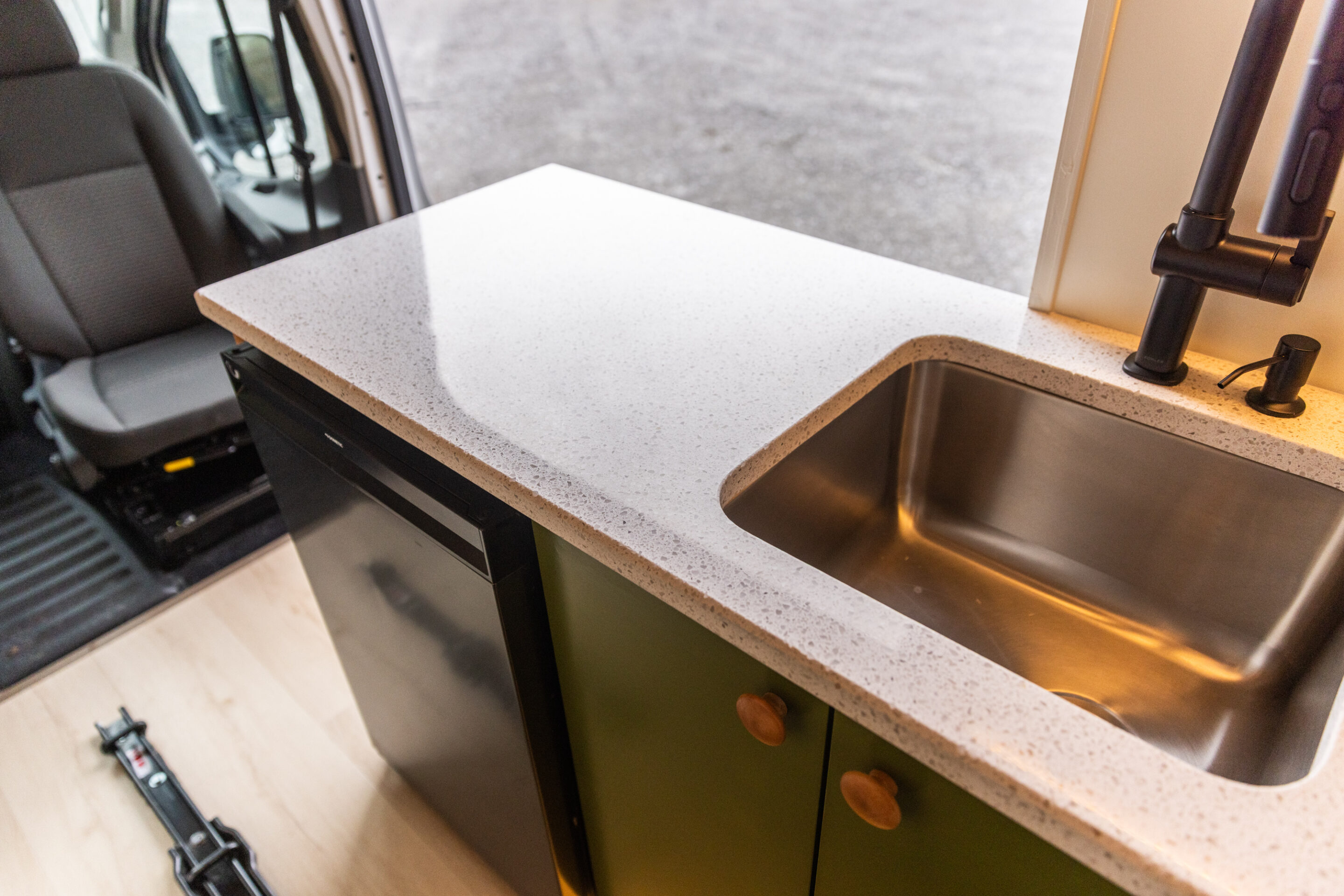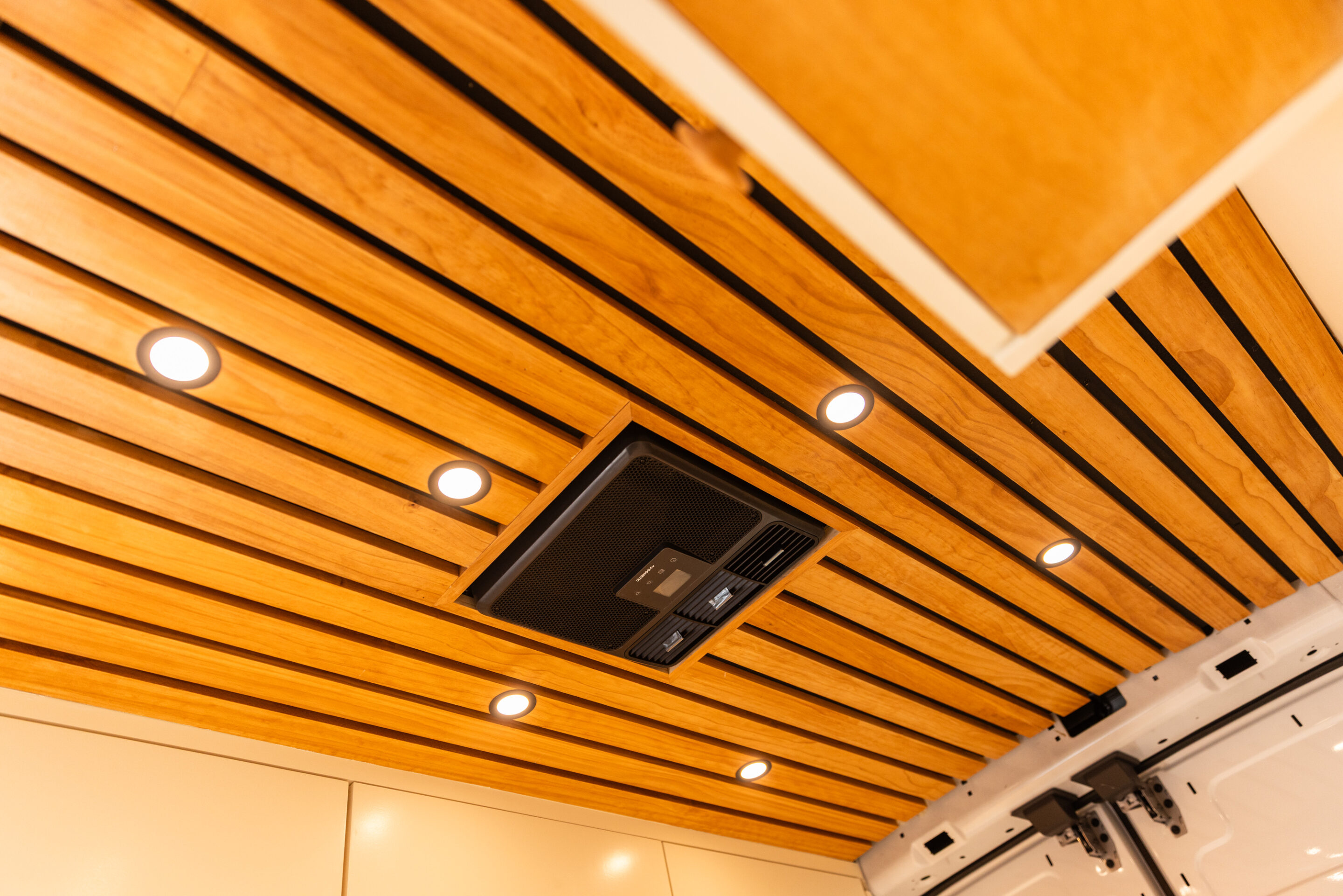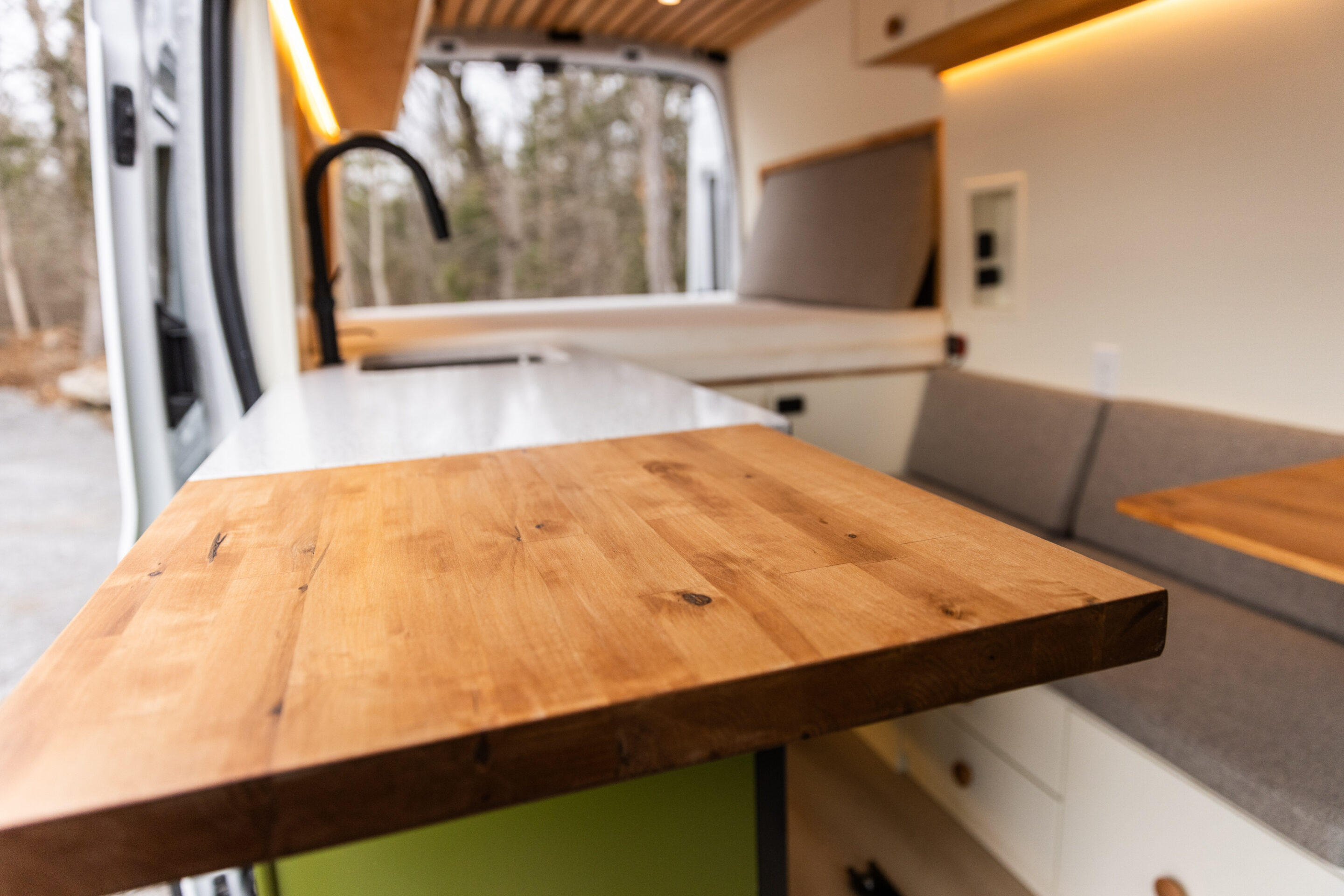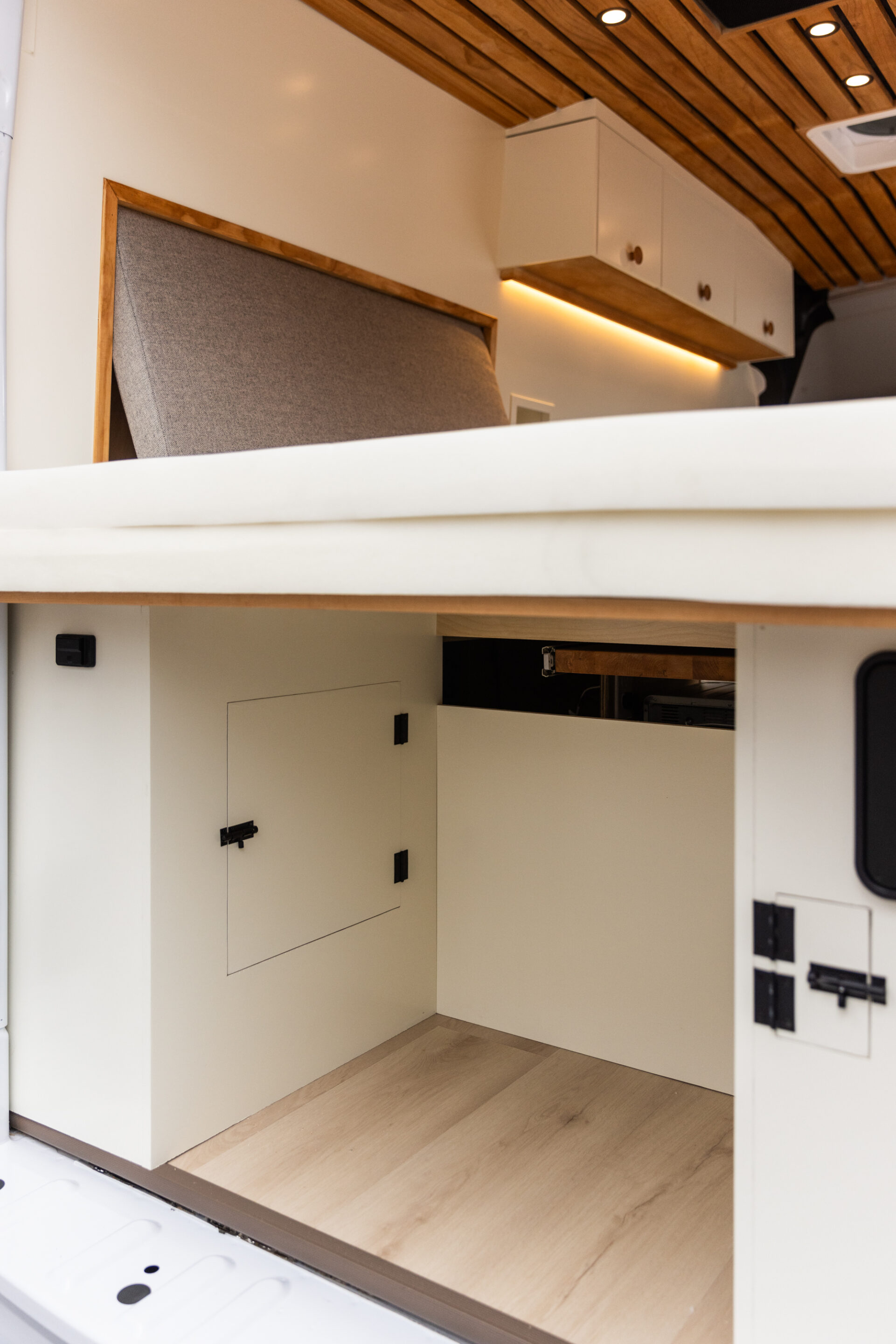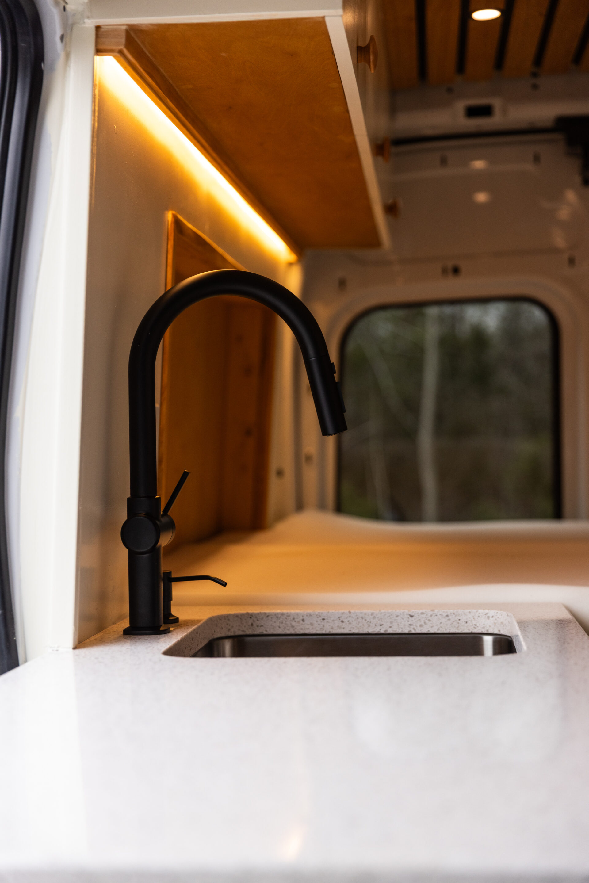 This custom Ford Transit 148 proves you don’t have to sacrifice comfort for adventure. Inside, you’ll find upgraded slat ceilings that add warmth and style, a quartz countertop with an undermount sink, and even a hidden cat litter box cleverly tucked under the bench. Heating, AC, and off-grid capabilities keep you comfortable year-round, while the removable bench seat gives you the flexibility to swap in a factory seat and bring up to four people along for the ride.