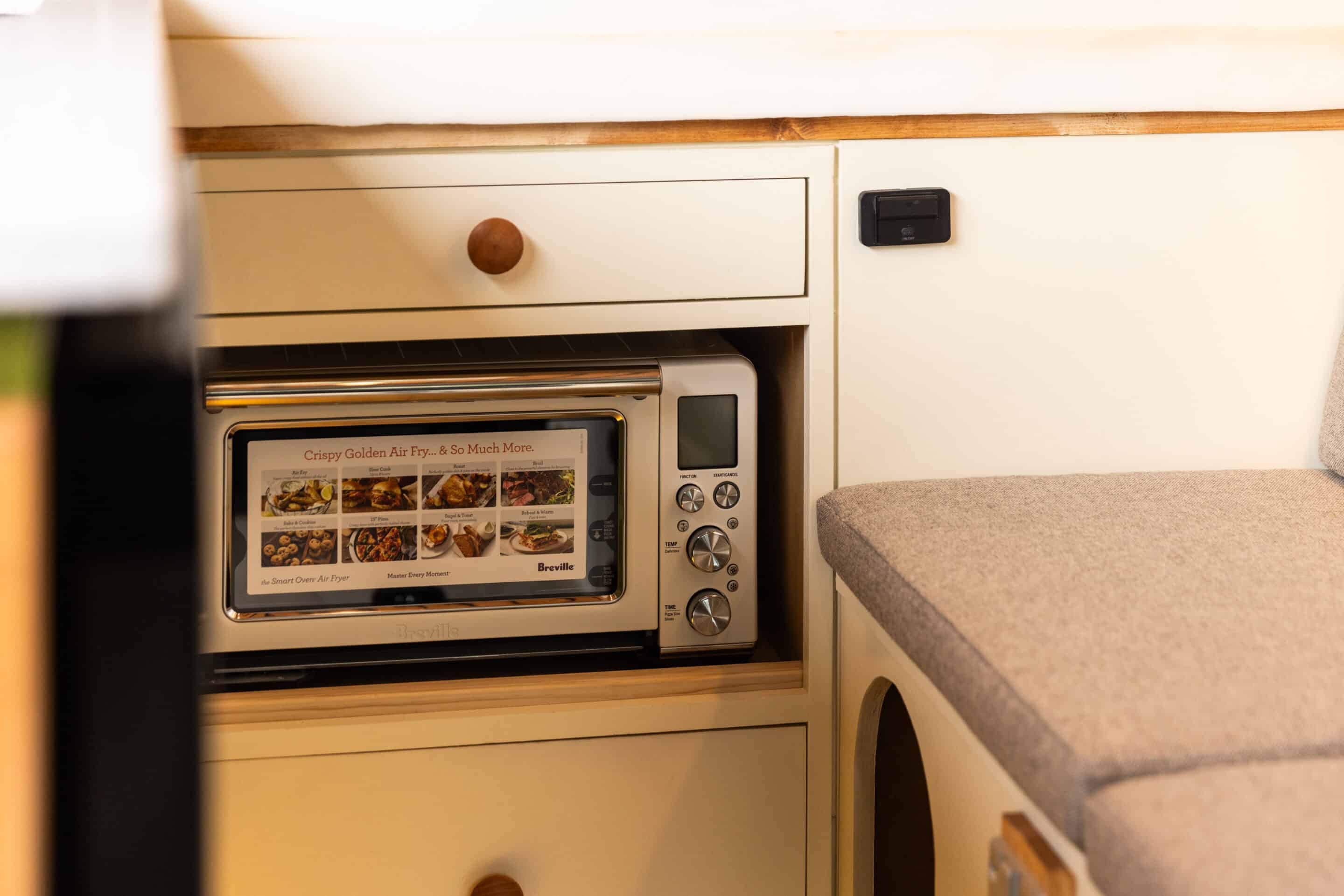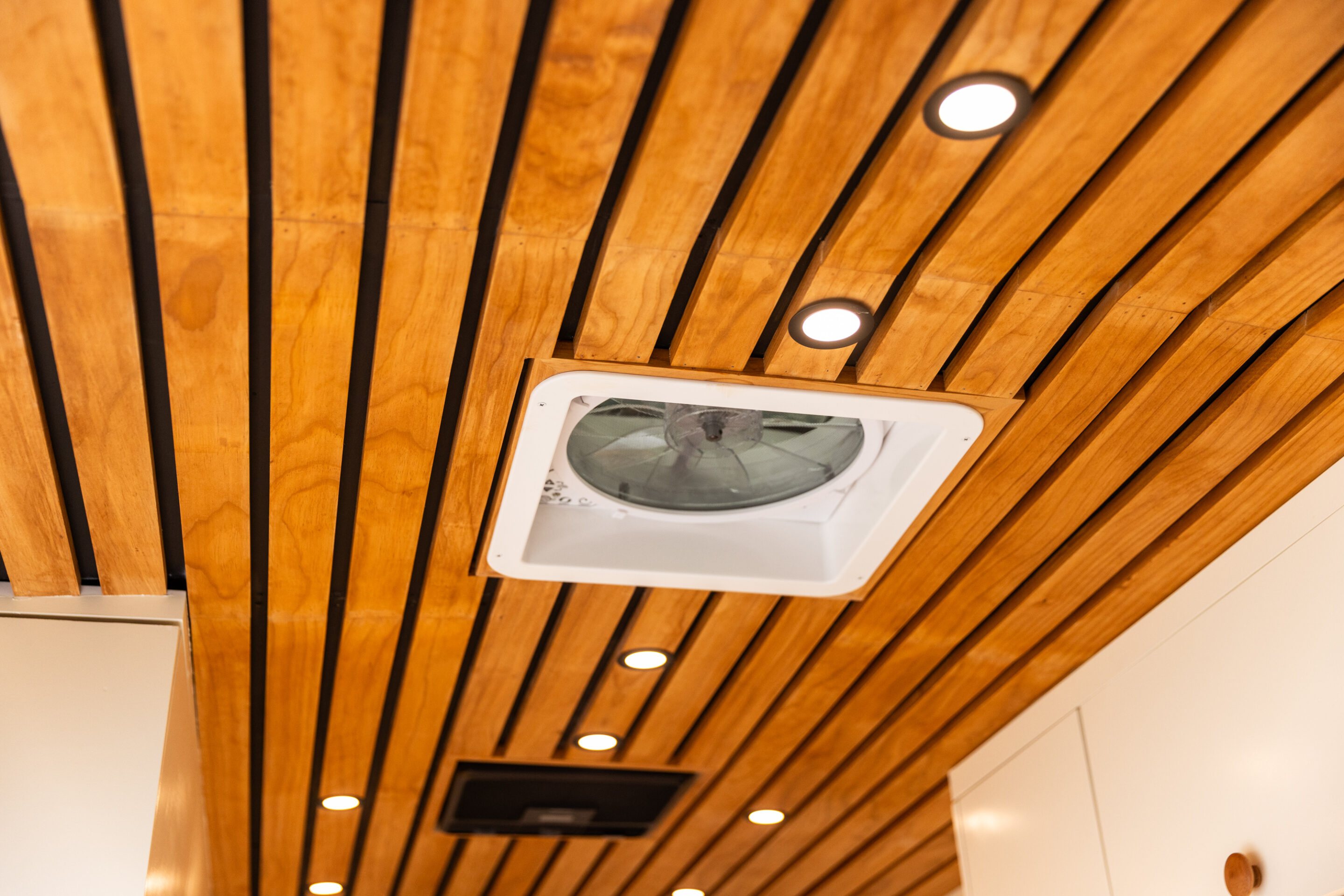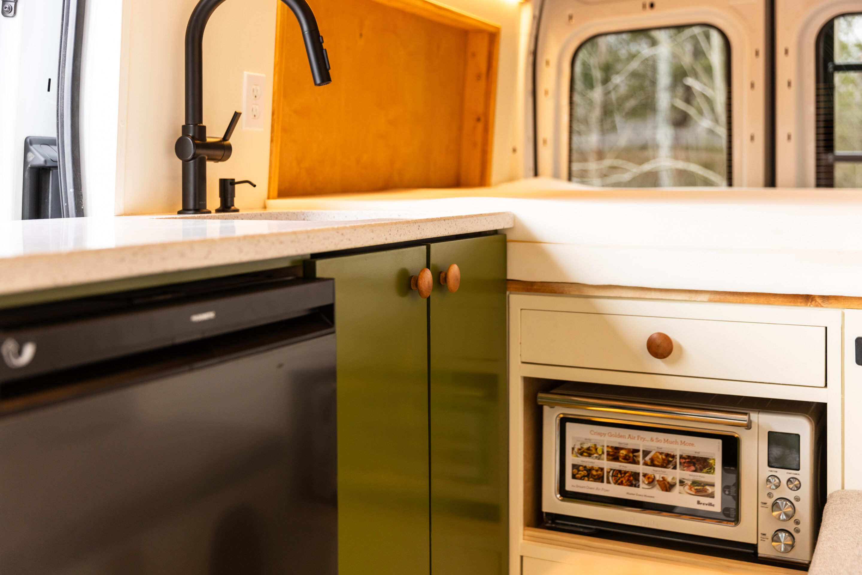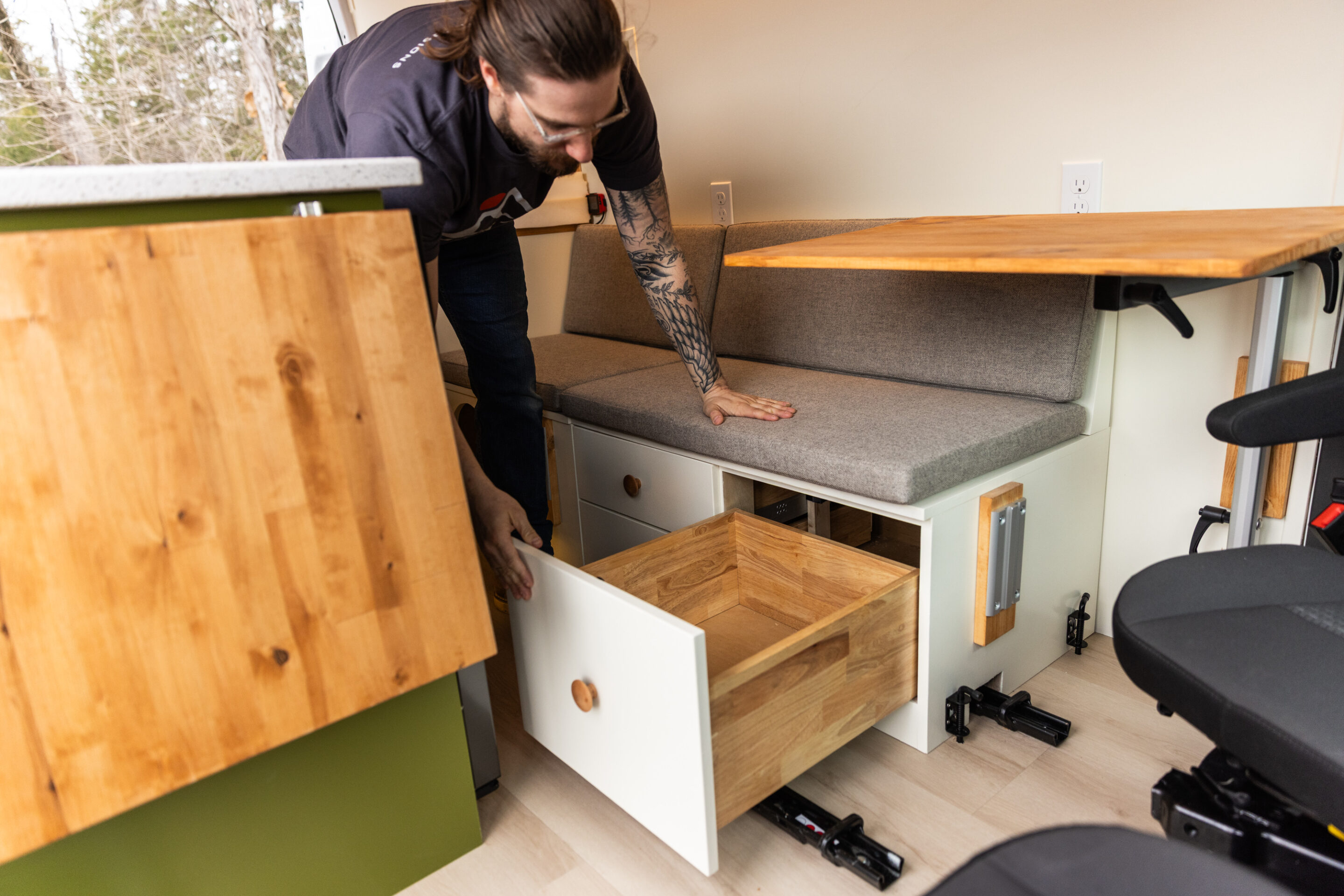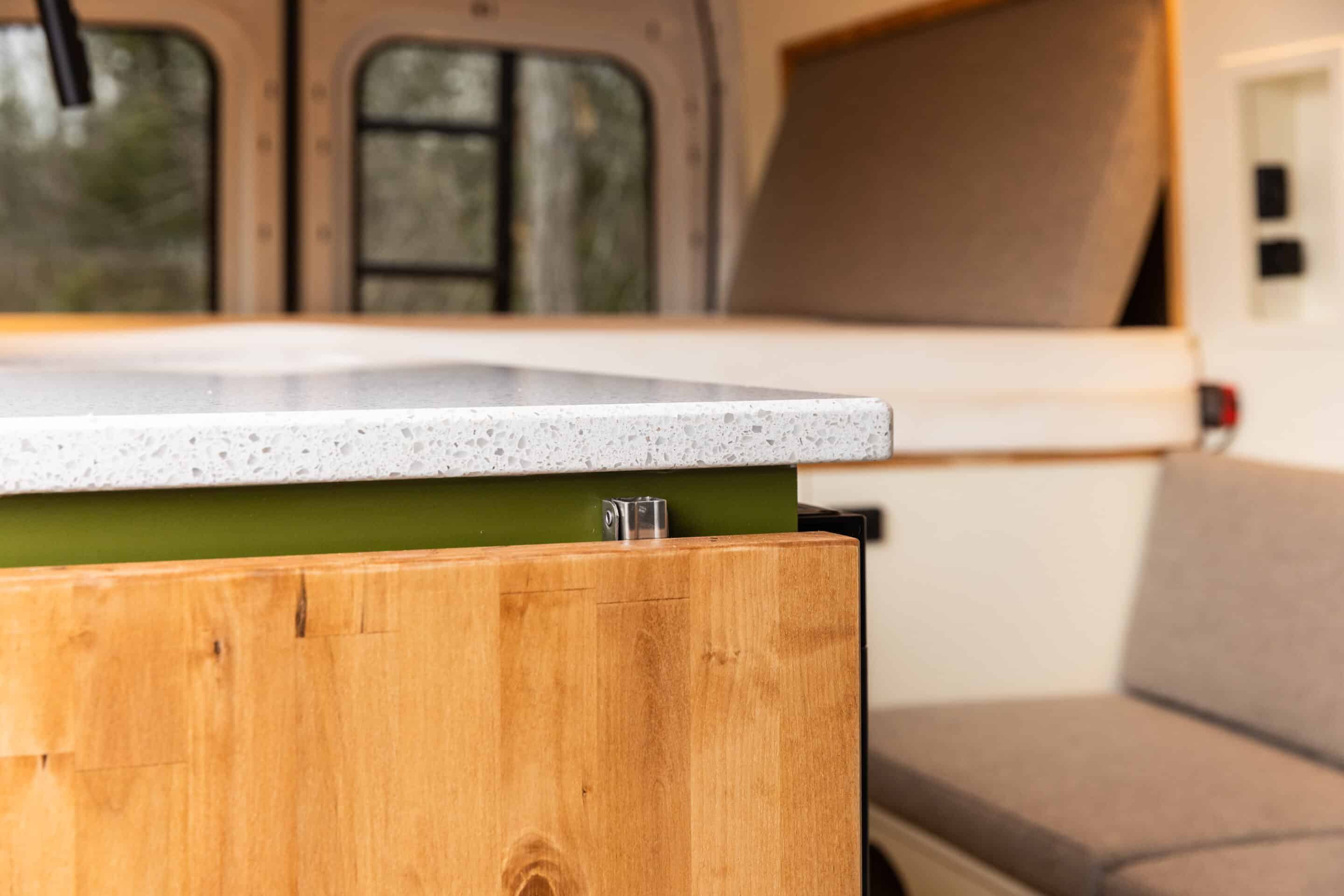 This custom Ford Transit 148 proves you don’t have to sacrifice comfort for adventure. Inside, you’ll find upgraded slat ceilings that add warmth and style, a quartz countertop with an undermount sink, and even a hidden cat litter box cleverly tucked under the bench. Heating, AC, and off-grid capabilities keep you comfortable year-round, while the removable bench seat gives you the flexibility to swap in a factory seat and bring up to four people along for the ride.