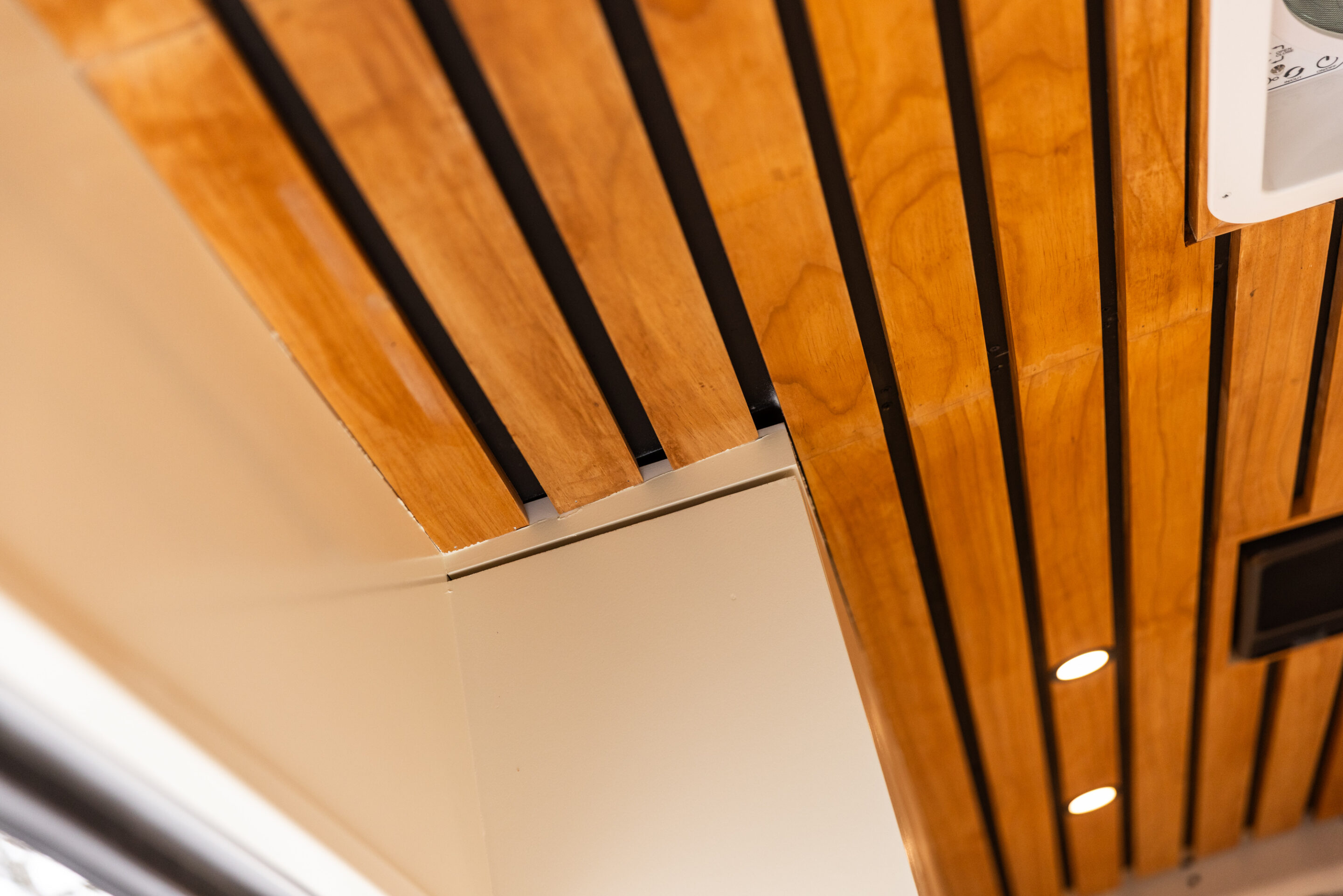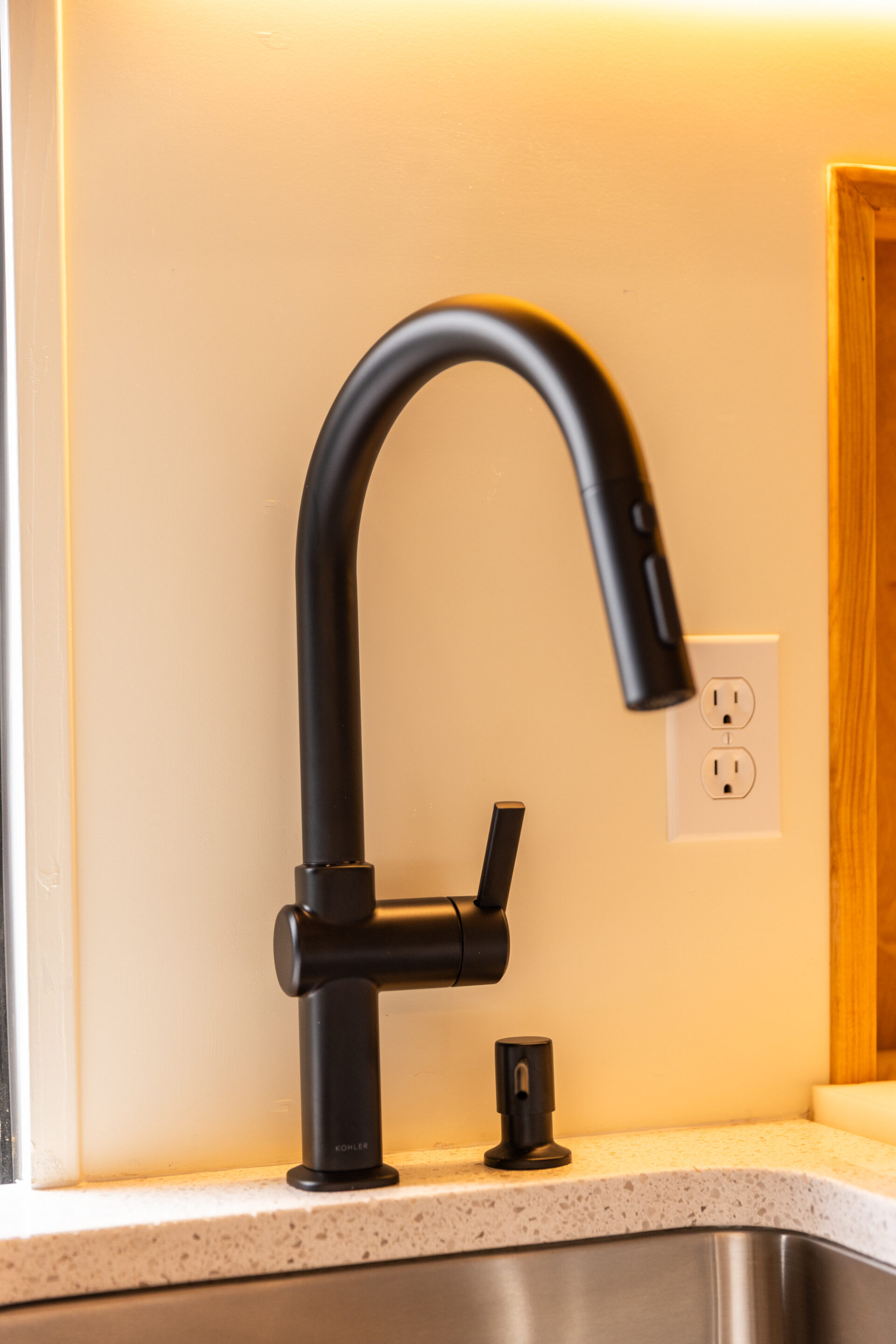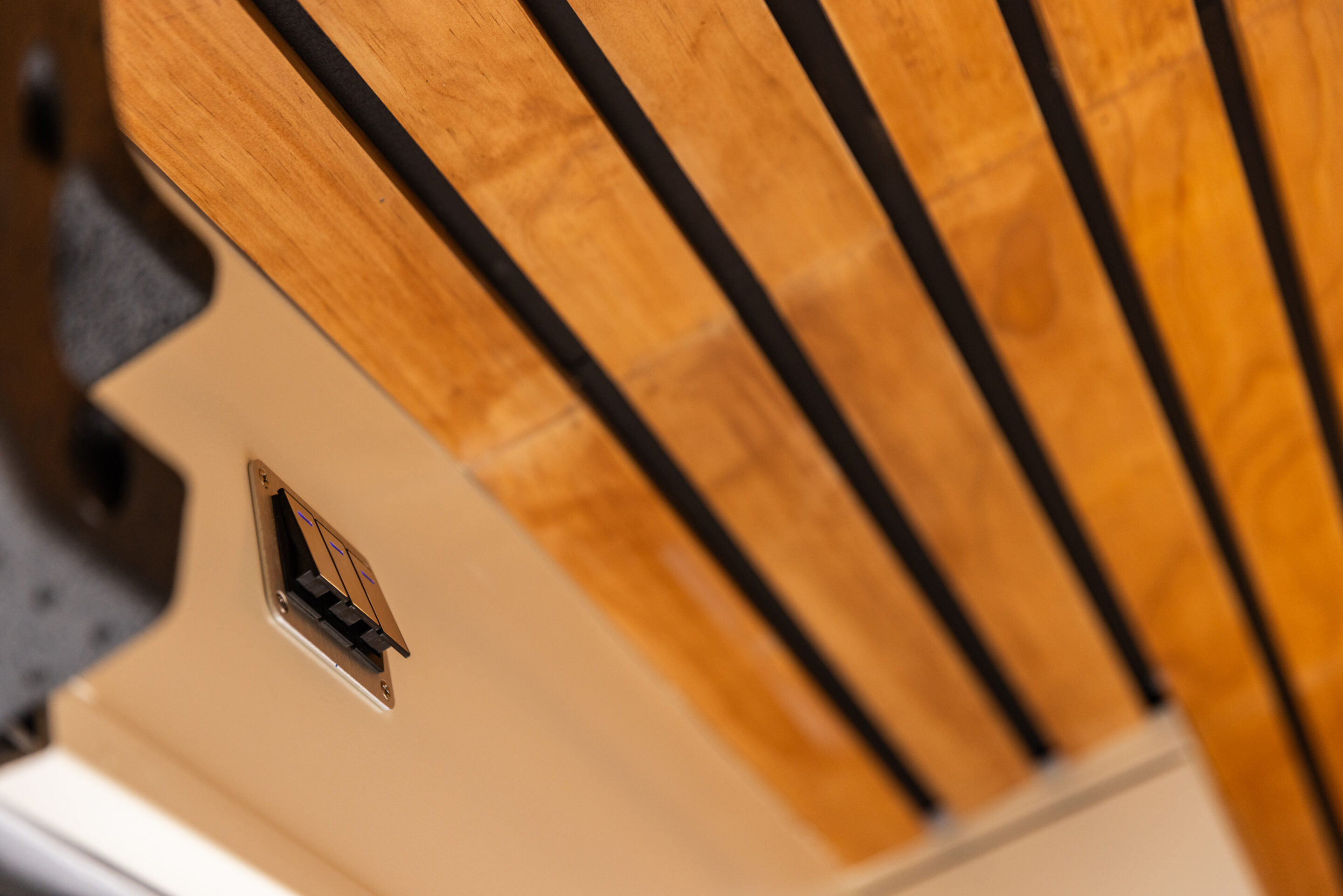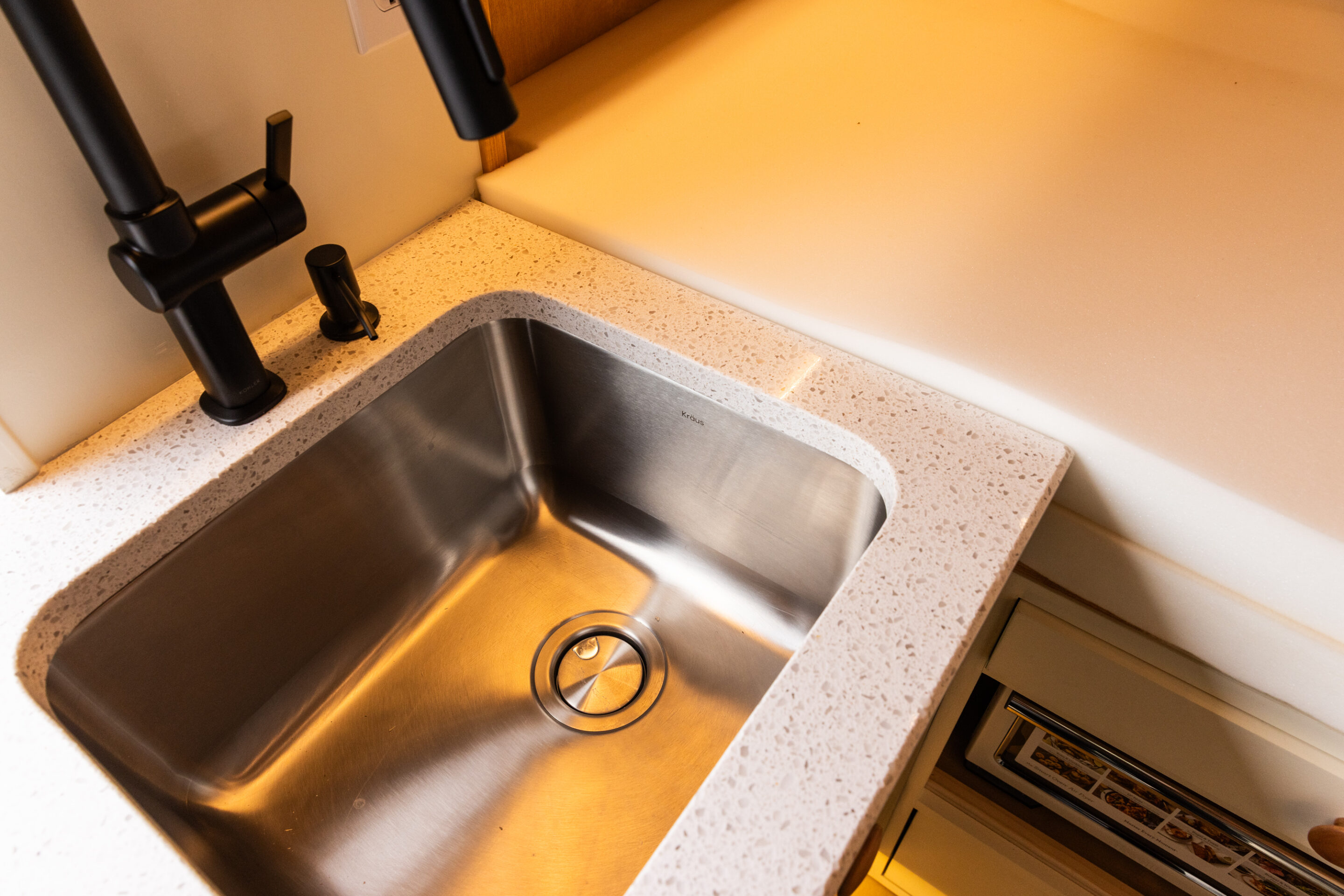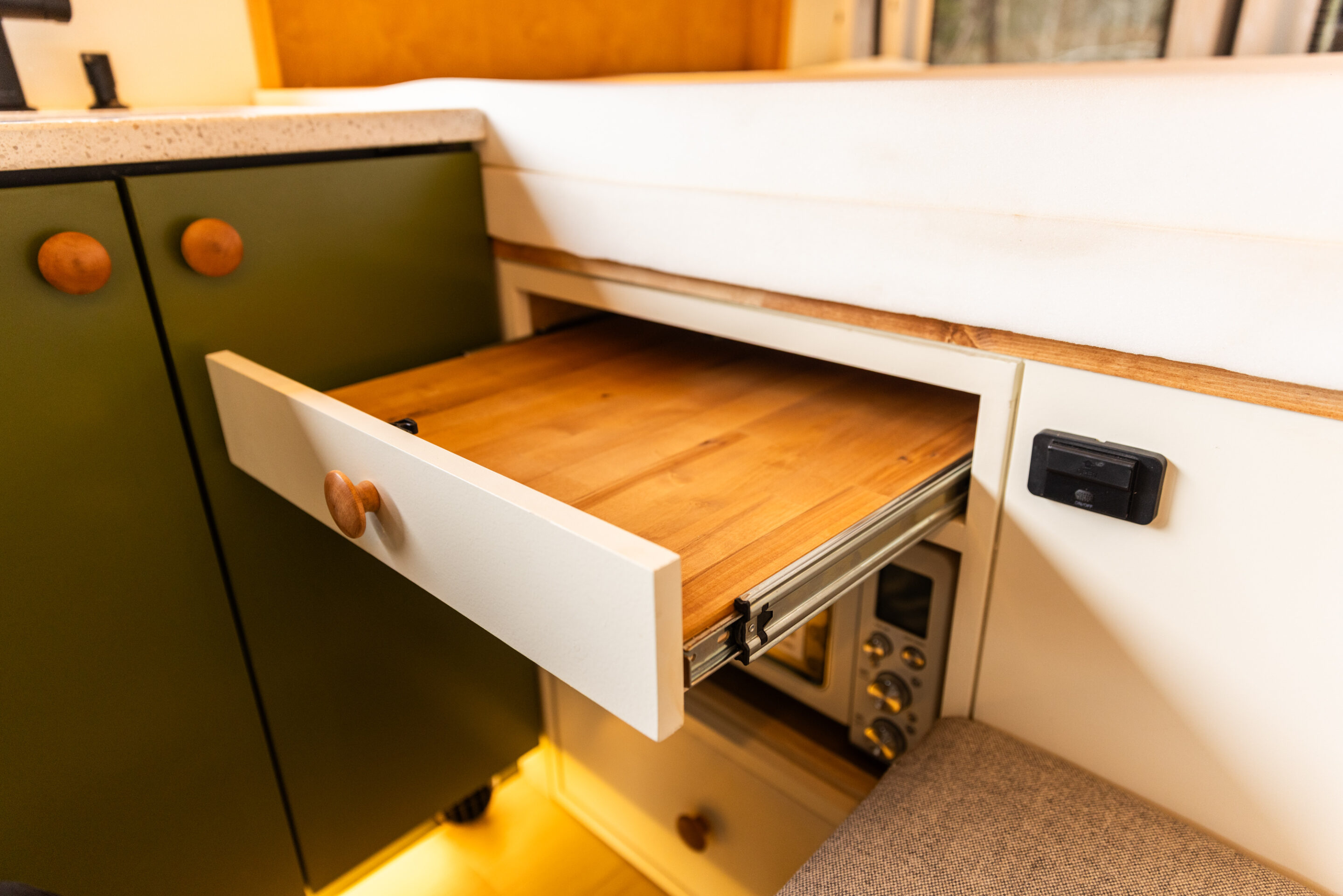 This custom Ford Transit 148 proves you don’t have to sacrifice comfort for adventure. Inside, you’ll find upgraded slat ceilings that add warmth and style, a quartz countertop with an undermount sink, and even a hidden cat litter box cleverly tucked under the bench. Heating, AC, and off-grid capabilities keep you comfortable year-round, while the removable bench seat gives you the flexibility to swap in a factory seat and bring up to four people along for the ride.